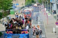 ZahlreicheTrucks ziehen mit einer tanzenden Partymenge um den Harburger Binnenhafen.